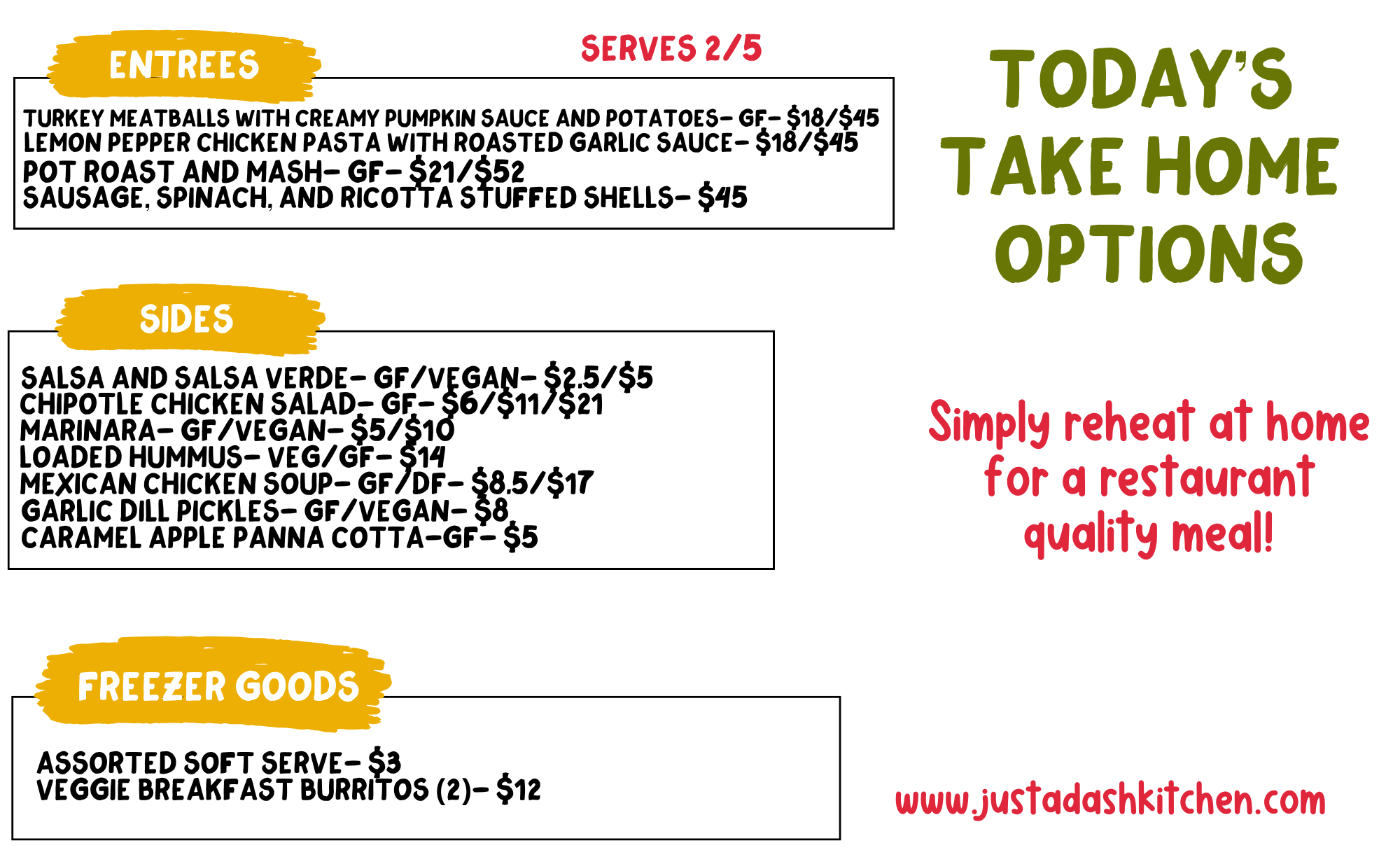 Take Home Meals, Snacks, Charcuterie, and Beverages