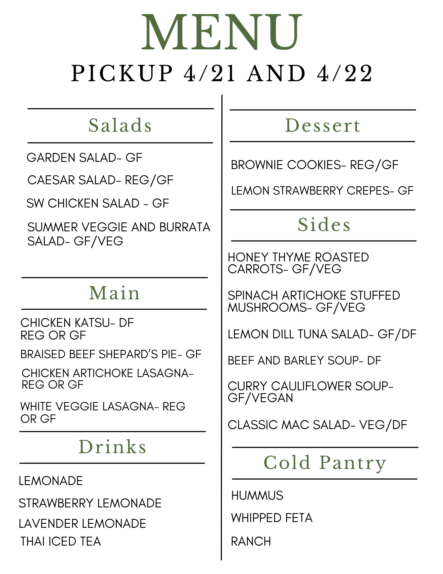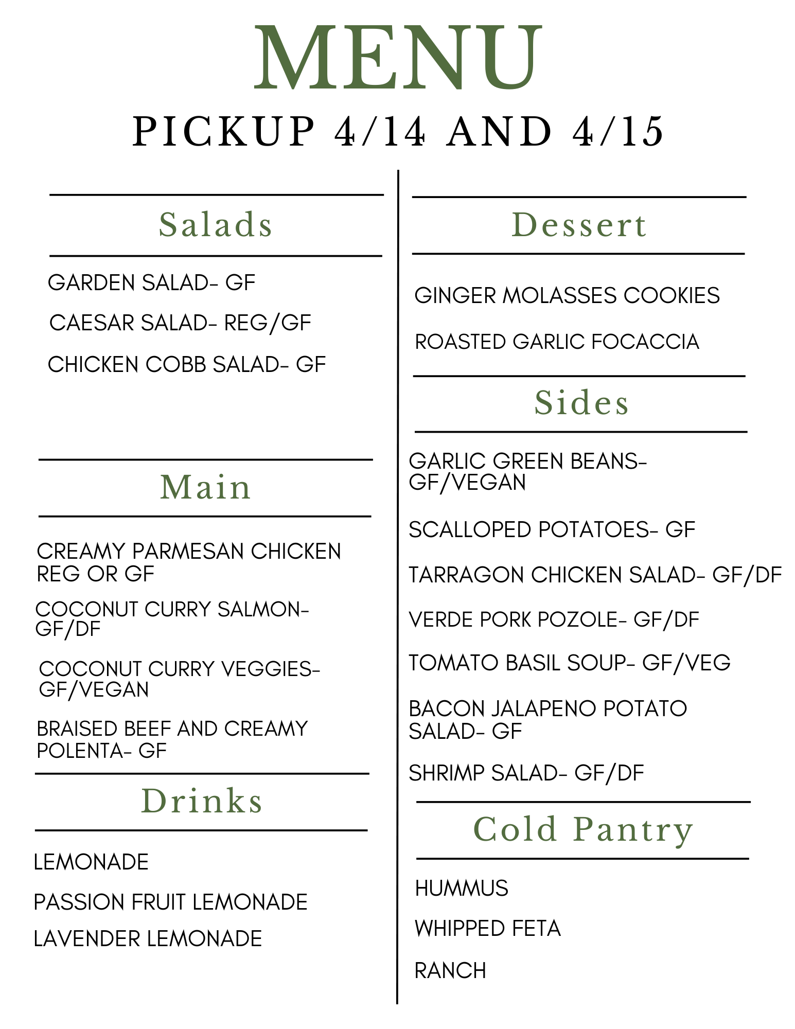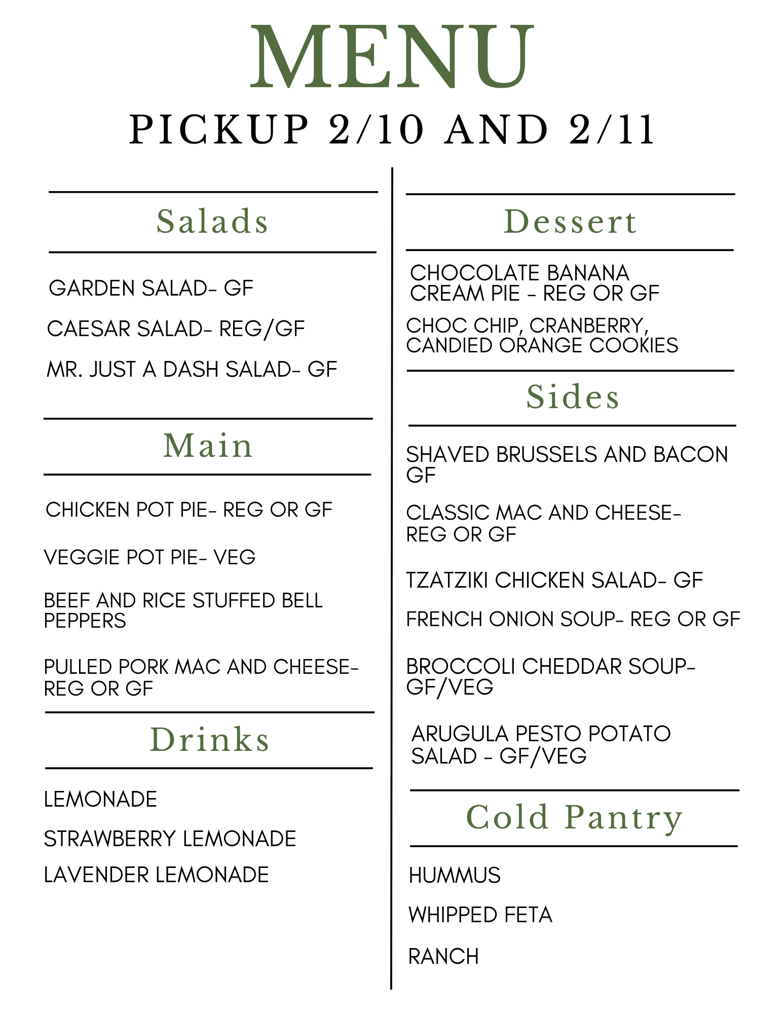Orders must be placed no later than the Friday before pickup and paid no later than the Saturday before.